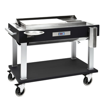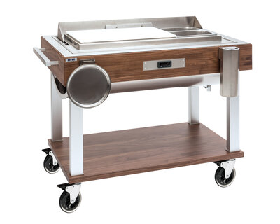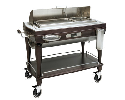 Die entnehmbare Metallhaube, welche jede Position hält, der Temperaturregler, die beiden Heizer außerhalb des Wasserbades, der magnetothermische Schalter und die Elektrik nach CE-Norm sind die Grundelemente unsere Tranchierwagen.