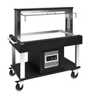 Our trolleys for dessert and cheese are designed in shape and size for an attractive and spectacular display service, which arouses the interest of the guest. Large transparent roll top covers of excellent quality allow a perfect view.