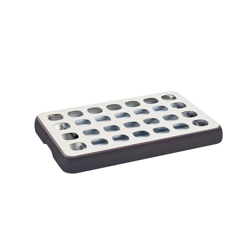 Plateau en PMMA avec 28 trous de Ø 5,5 cm pour pots de yaourt ronds et rectangulaires.