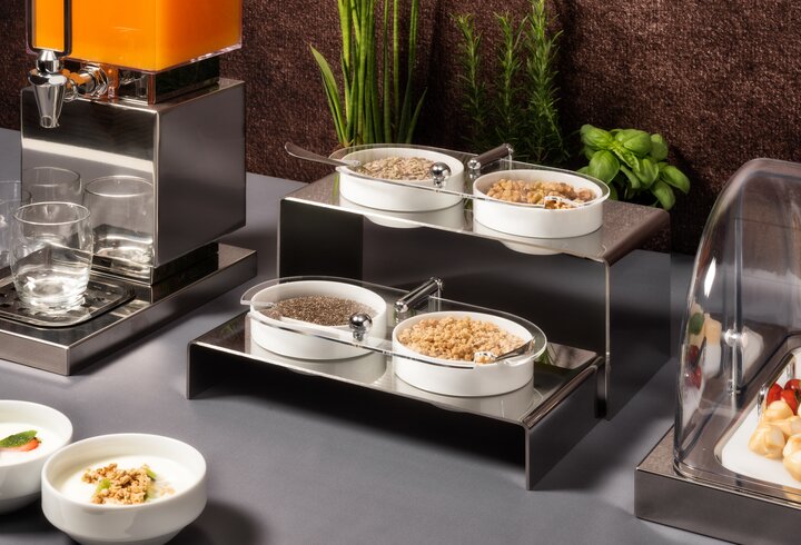 Tutti gli articoli da buffet come espositori, distributori bevande e cereali, devono riflettere la qualità del cibo che viene esposto. Il buffet deve formare una unità compiuta per essere attraente - una gioia per gli occhi.