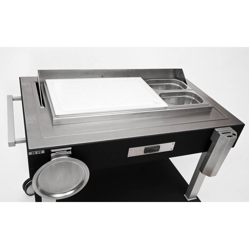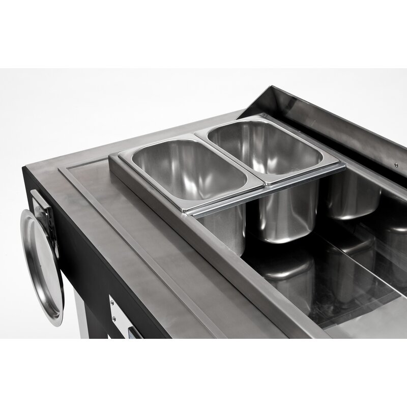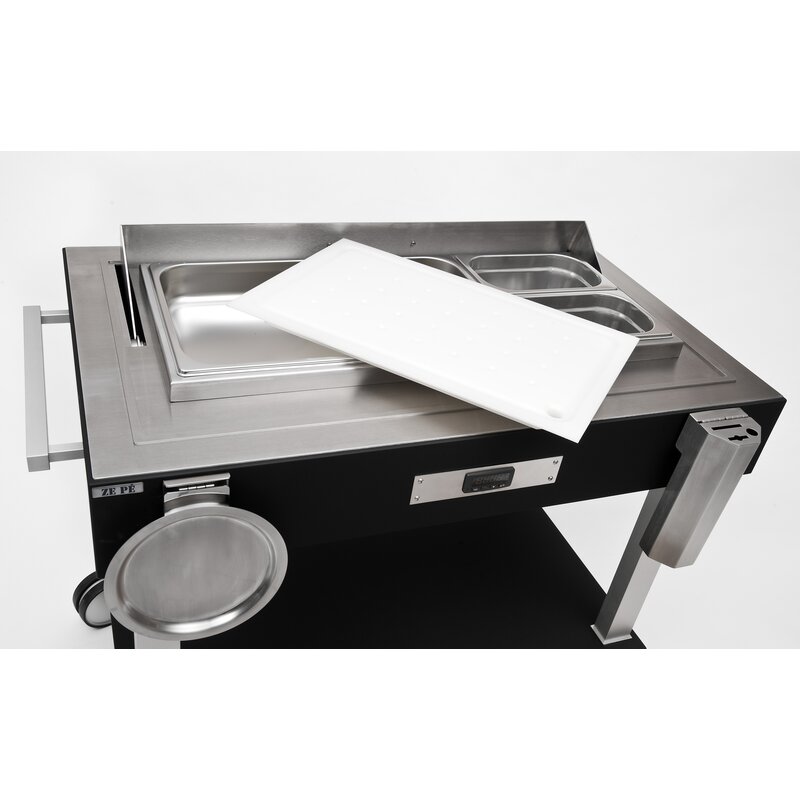 Una bacinella GN 1/1 H 6 cm con tagliere in polietilene bianco e due bacinelle GN 1/4 H 15 cm per salse