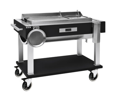 Die entnehmbare Metallhaube, welche jede Position hält, der Temperaturregler, die beiden Heizer außerhalb des Wasserbades, der magnetothermische Schalter und die Elektrik nach CE-Norm sind die Grundelemente unsere Tranchierwagen.