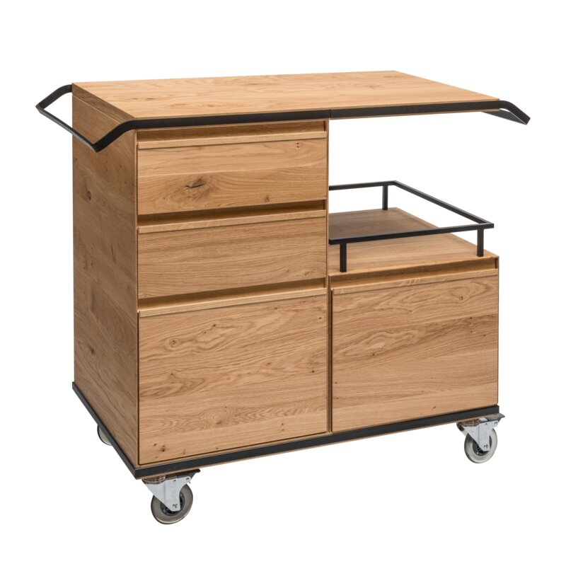Serving oak trolley with cupboard and 3 drawers